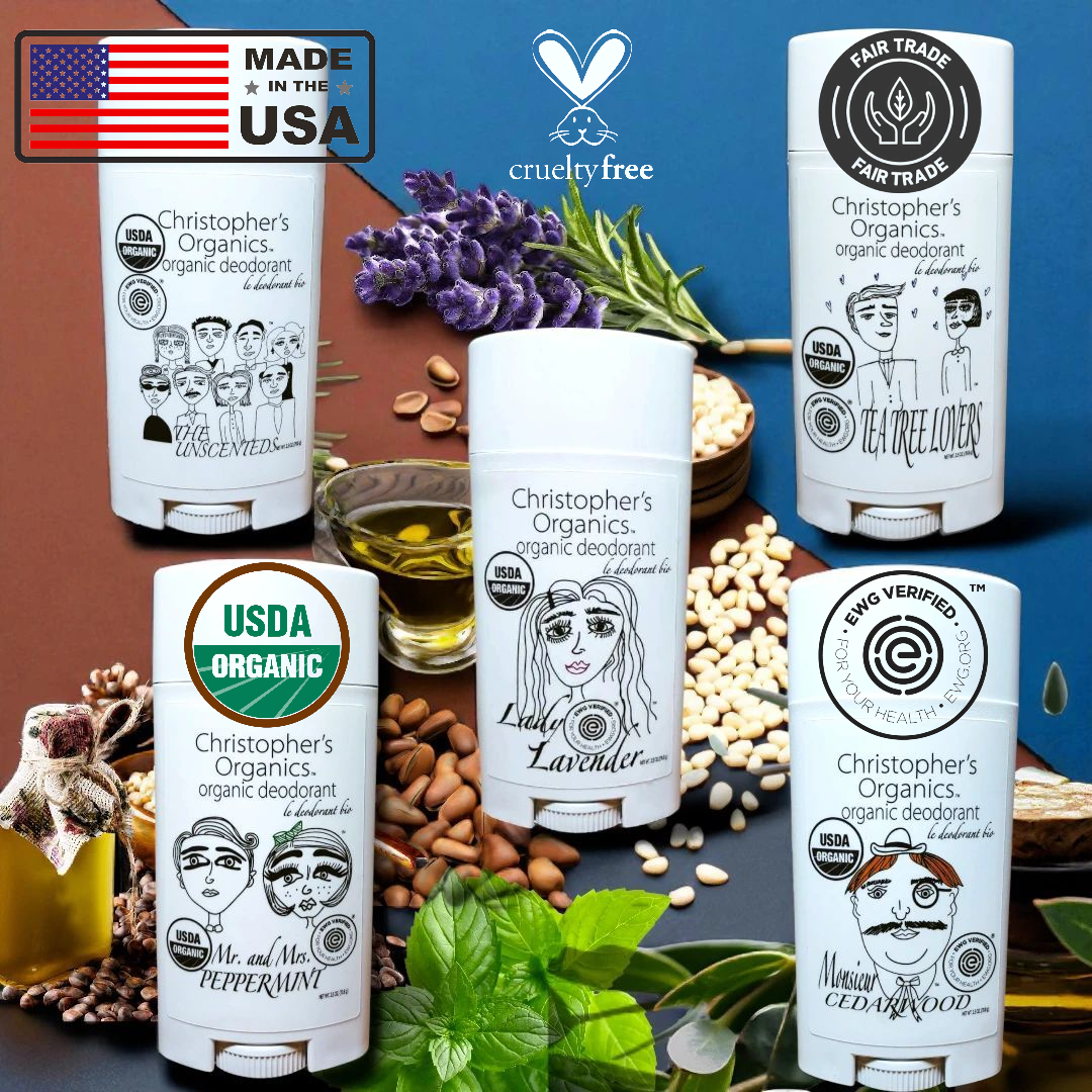 At Christopher’s Organics, we go beyond “natural.” Our deodorants are made with USDA Certified Organic ingredients—no shortcuts, no compromises. We believe your skin deserves the best. That’s why our formulas are aluminum-free, paraben-free, cruelty-free, and verified by the Environmental Working Group (EWG) for safety and transparency. Every stick is handcrafted with care in the USA.